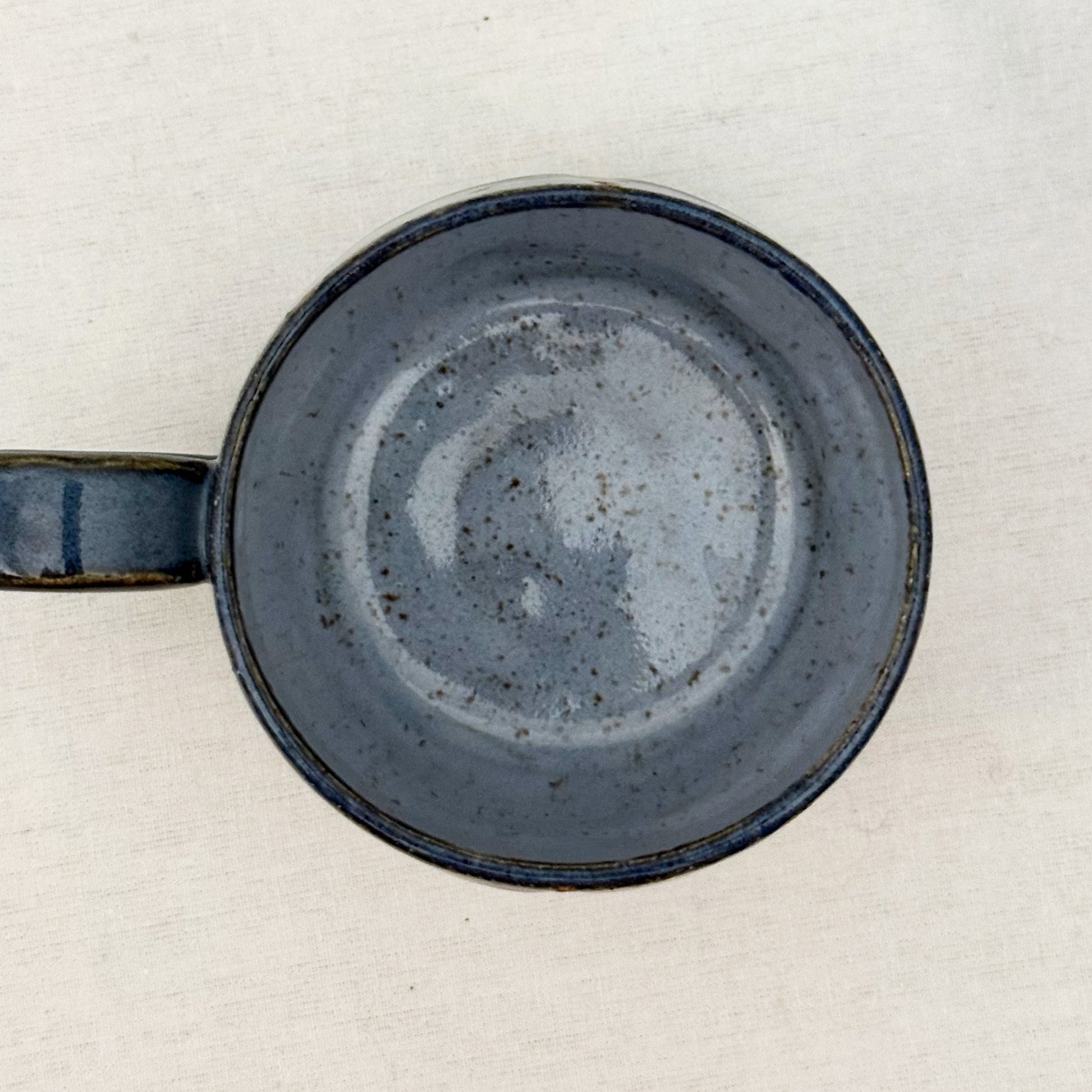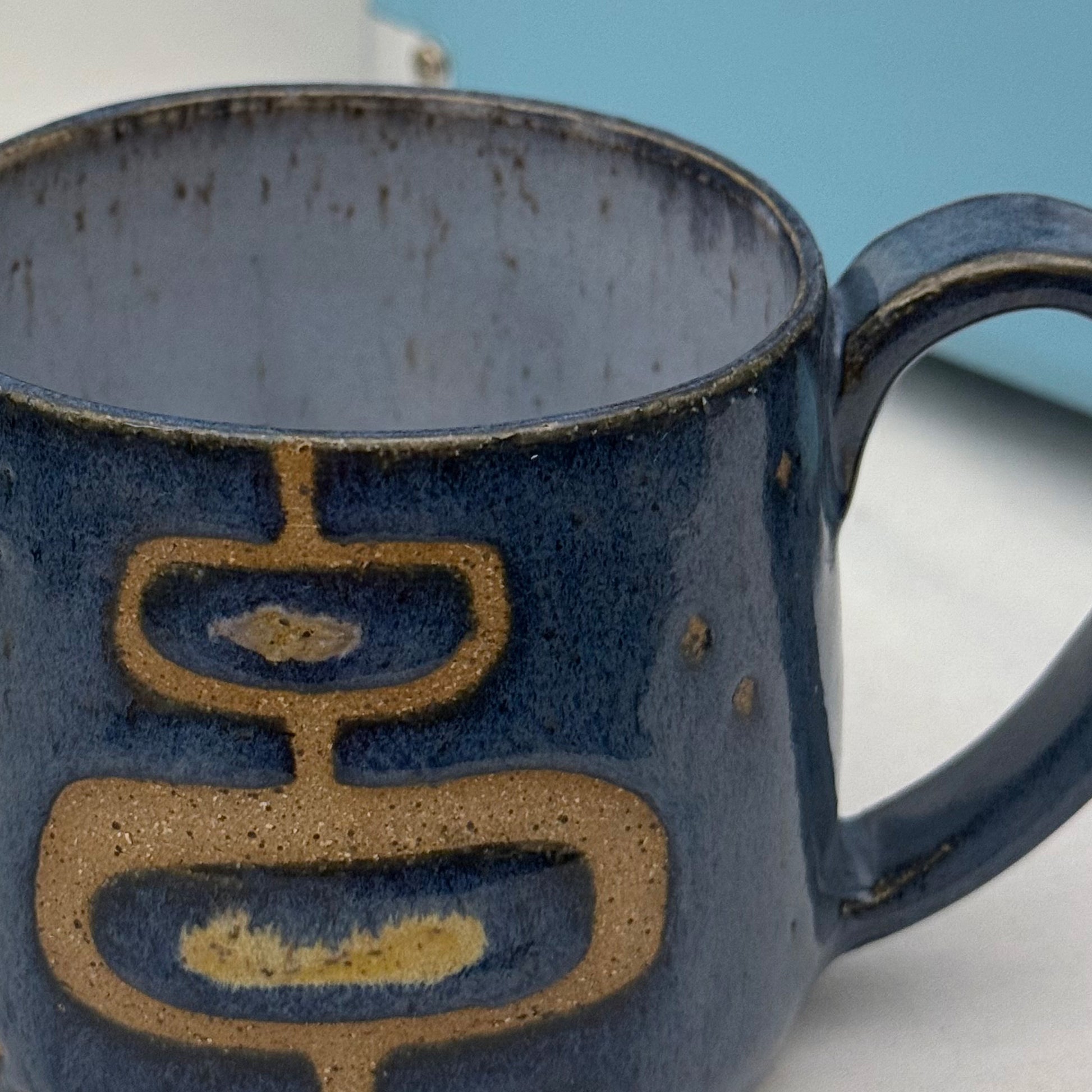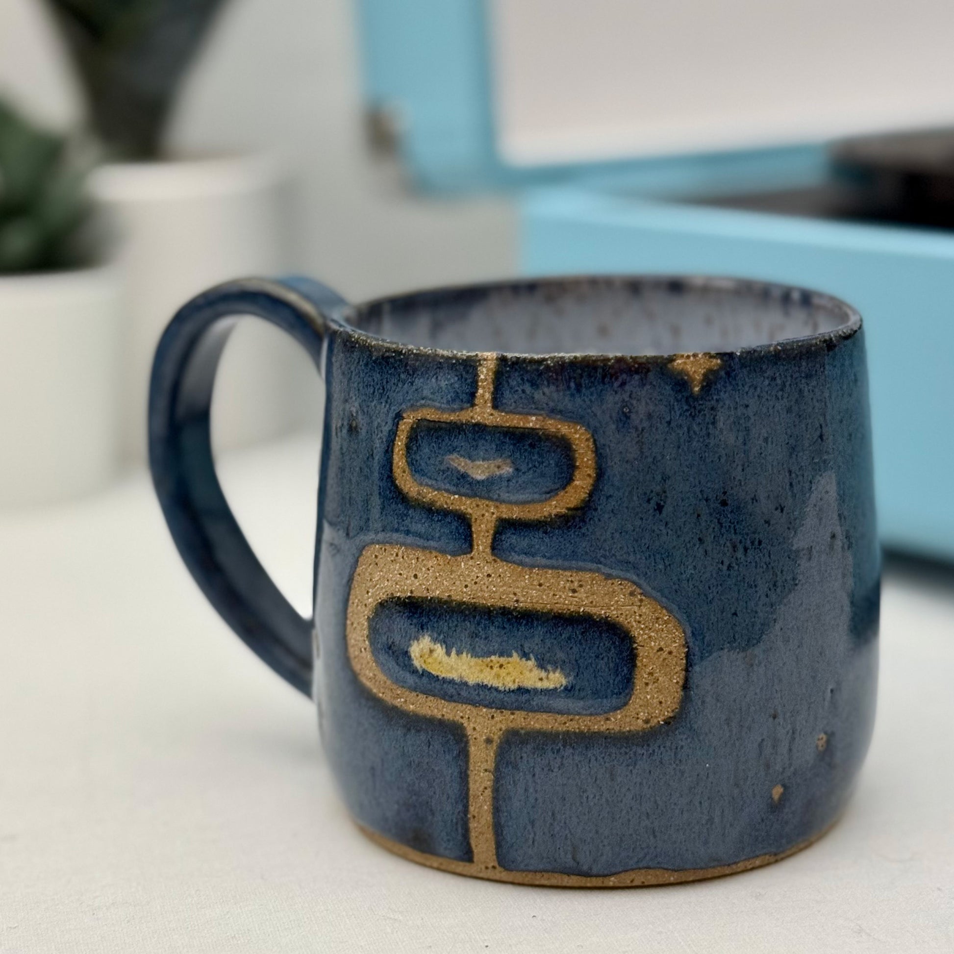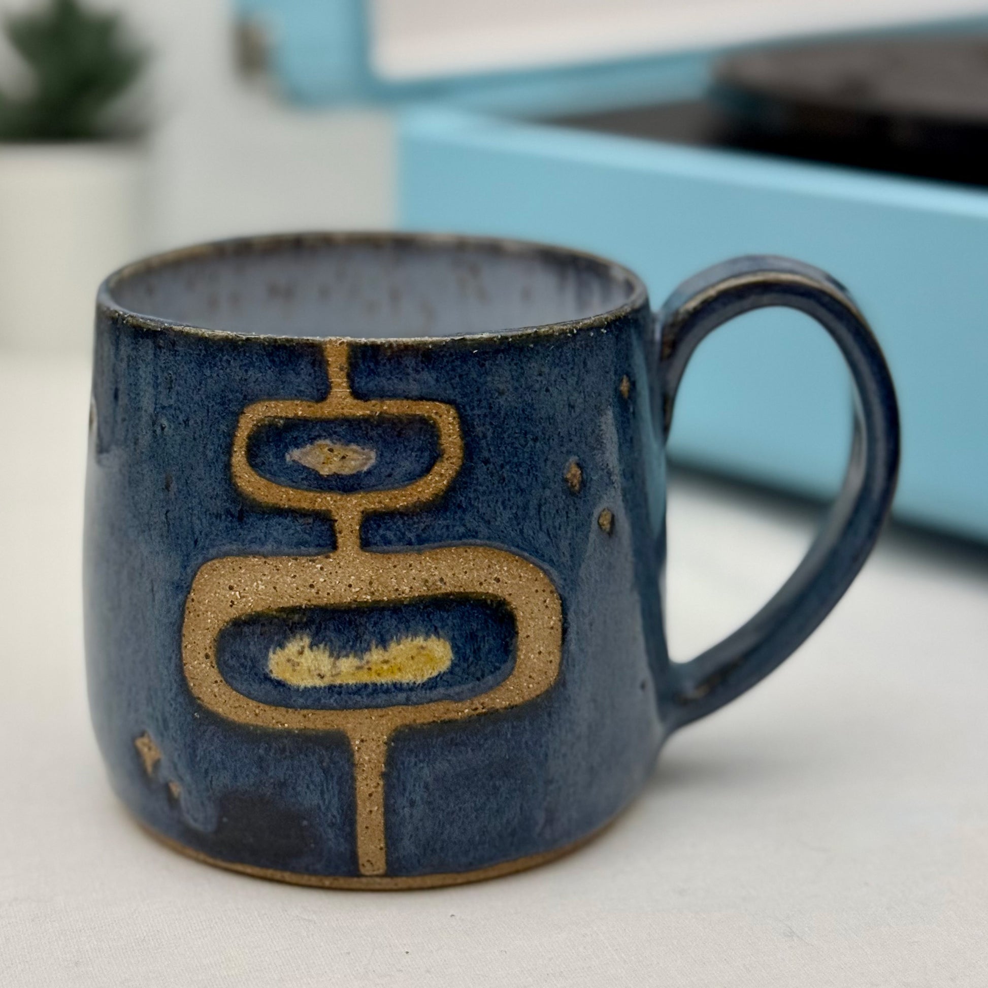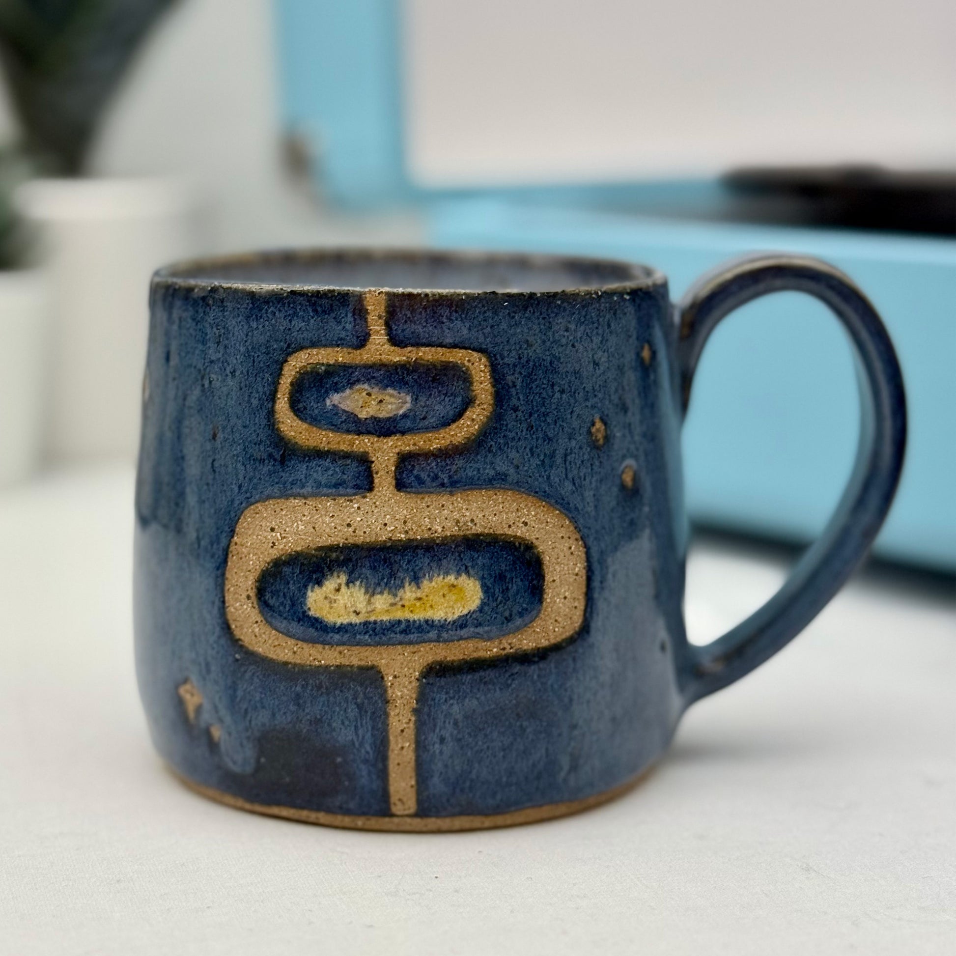 Retro flair meets everyday function. This handmade stoneware mug features a deep blue glaze with naked clay peeking through in bold mid-century atomic shapes, accented by a pop of sunny yellow at the center. Its straight-sided body and easy-grip handle make it perfect for your daily brew, while the vintage-inspired design keeps it looking fresh on the shelf.