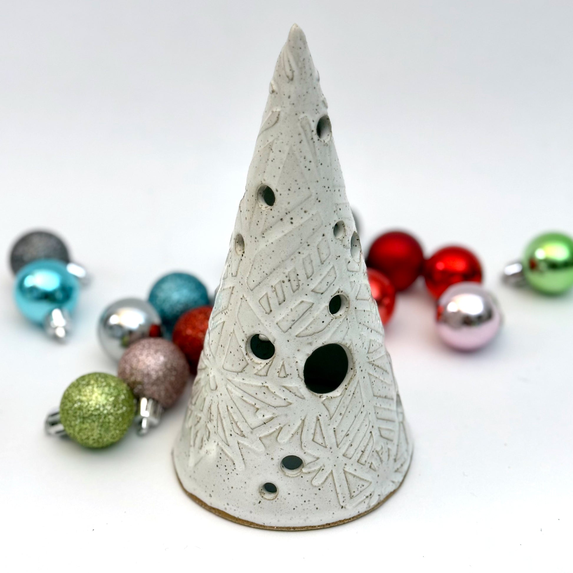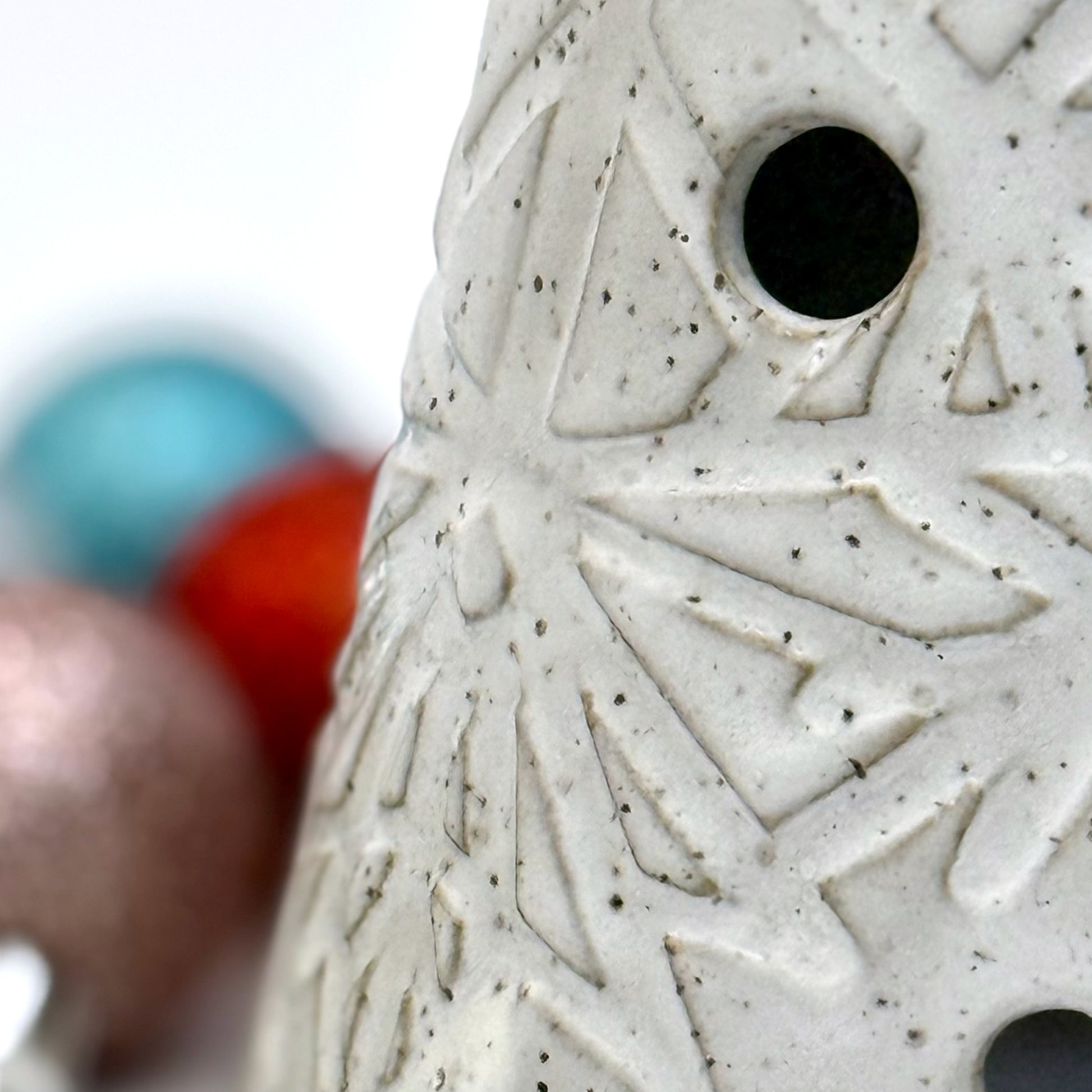 This tall snowy-white luminary tree features a bold oversized snowflake pattern pressed into the clay. Scattered round glow holes let warm candlelight shine through, creating a soft, wintry shimmer. Its height makes it a beautiful statement piece for mantels, shelves, or holiday centerpieces—perfect for adding mountain-top winter magic to your décor.